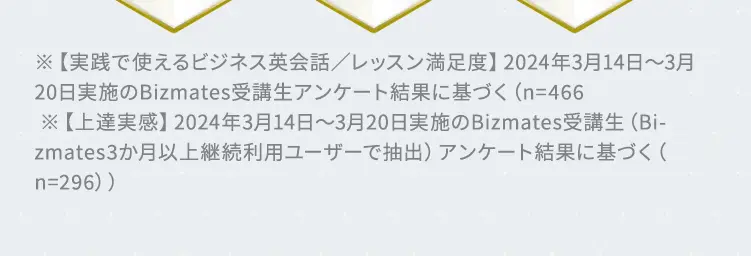 ※【実践で使えるビジネス英会話/レッスン満足度】2024年3月14日~3月20日実施のBizmates受講生アンケート結果に基づく(n=466)
